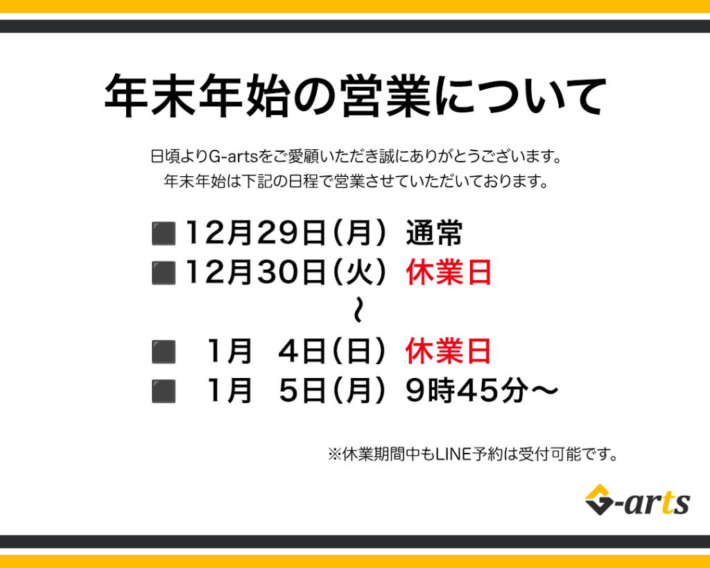 年末年始の営業について 投稿日: 2025年12月26日 (2025年12月26日) 投稿者: %s nishiokaseikotsuin 日頃よりG-artsをご愛顧いただき誠にありがとうございます。年末年始は上記の日程で営業させていただきます。また、休業期間中もLINE予約の受付は行っております。来年も引き続き、当院をよろしくお願い申し上げます。